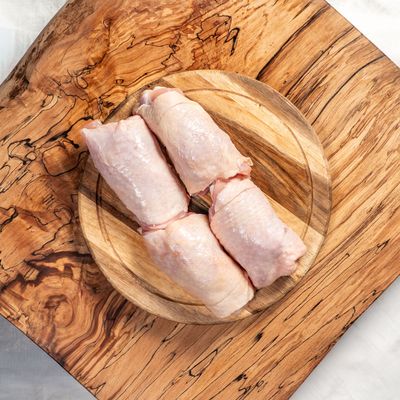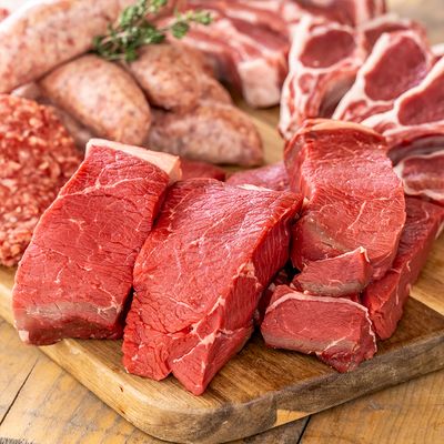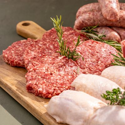 A weekend box for four. Dry-aged burgers from our own herd, king ribs, boneless chicken thighs and our own handmade Cumberland pork sausages.